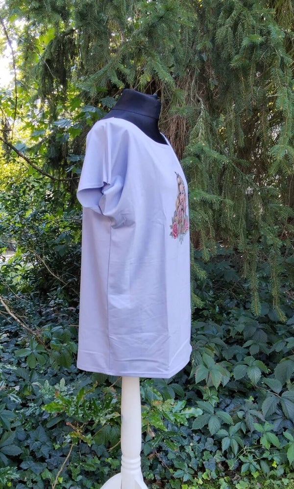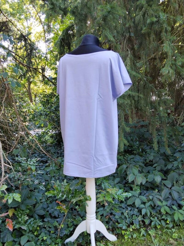 Hier habe ich einen Flieder Farbigen Baumwolljersey vernäht zum Damenshirt mit angeschnittenden Ärmel.