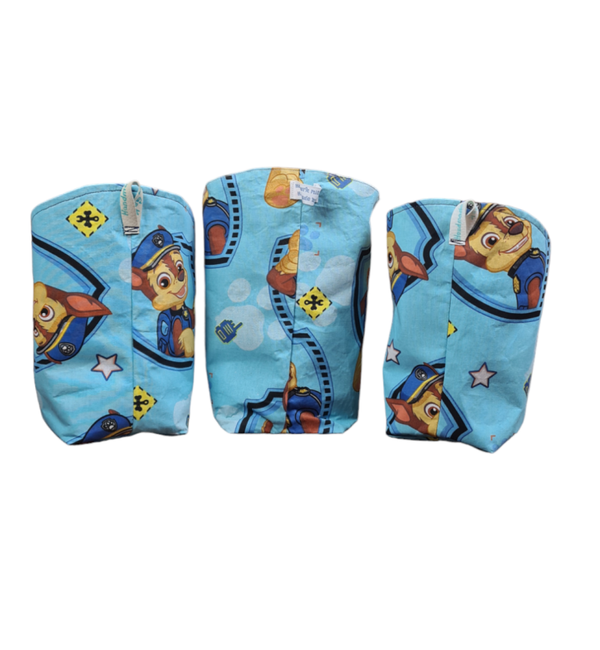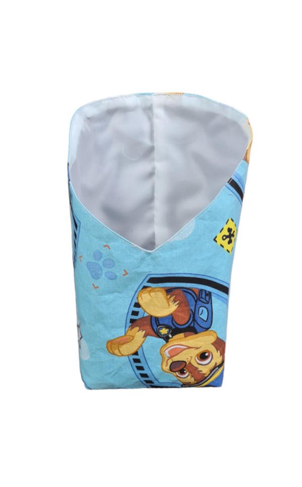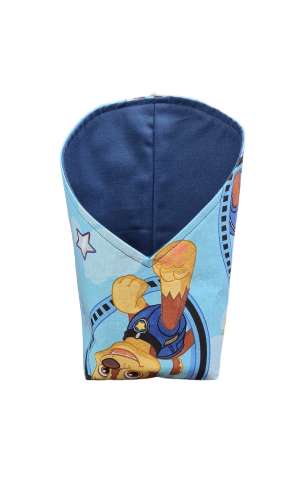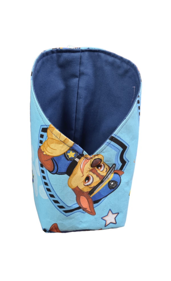 Modell 3 : Kleines Utensil Pfote vorne 10,5cm breit vorne,10cm hintere breite,- Tiefe 10cm,- vordere Höhe 11cm,hintere Höhe 21cm,- Außenstoff: Blau Paw Patrol 100% Baumwolle