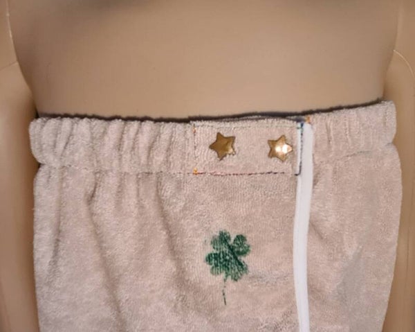 Modell 6 : Hellbeige Frottee mit 2x goldene Sterne Druckknöpfe, Motiv Kleeblatt