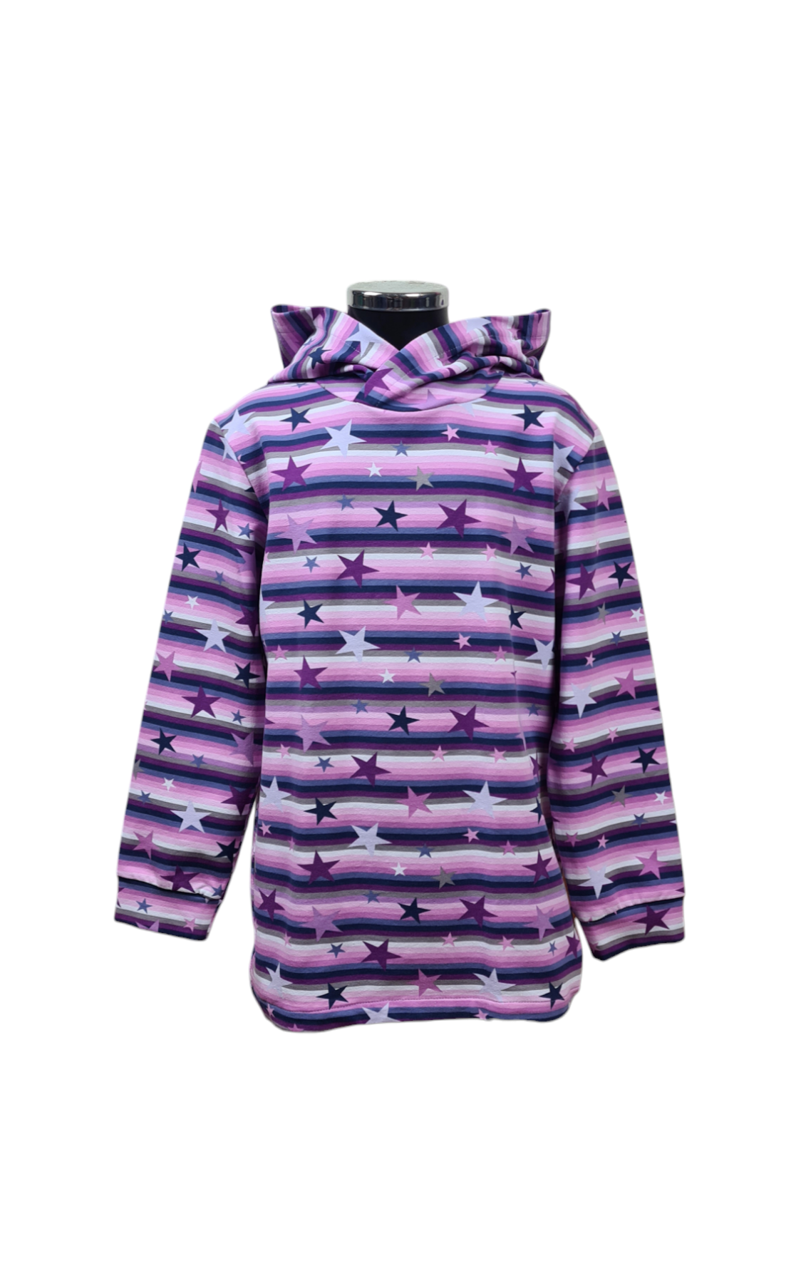 Die Kapuze ist ein wenig groß zugeschnitten so das auch platz ist für Kopfhörer 🎧 oder bei Mädchen der Zopf ☺️ platz hat. Am Foto sieht man auch das vorne am Hals die Kapuzen enden überkreuz eingenäht wurden gerade für Winter angenehmer da am Hals mit Schal alles geschlossen ist.