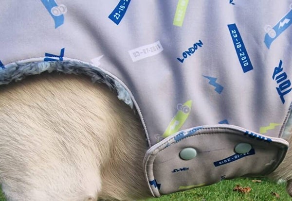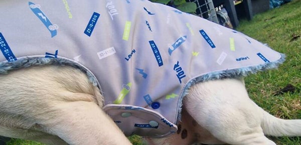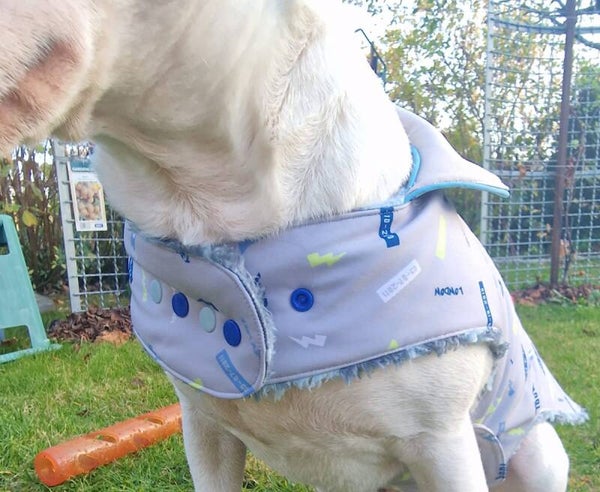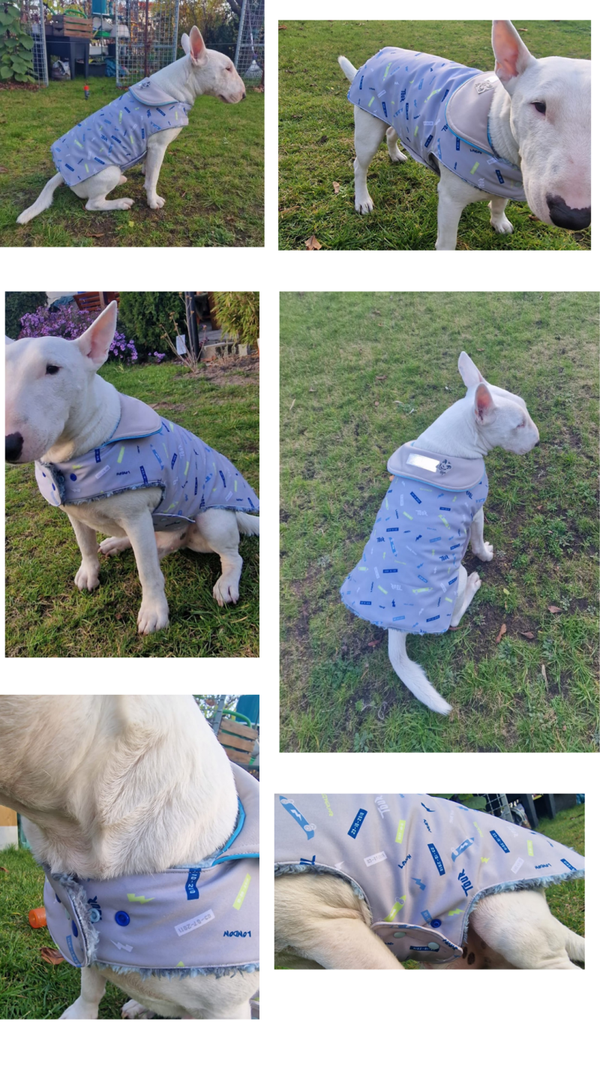 Am Kragen haben wir blaues Reflektorband eingenäht und in der Mitte beide Seite ein Reflektorstreifen.